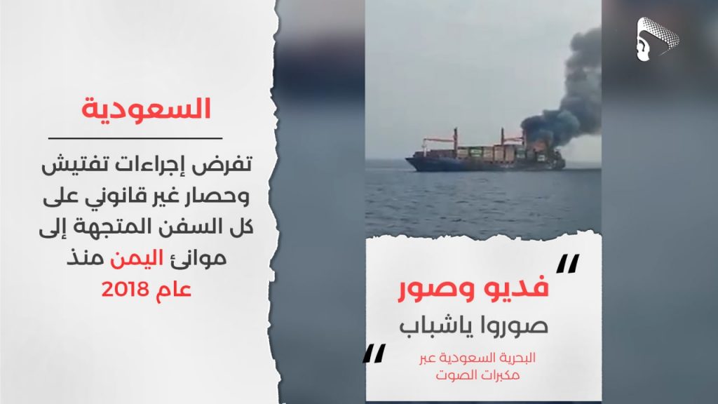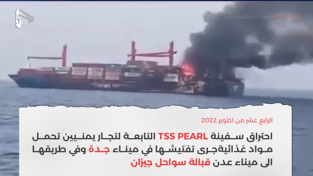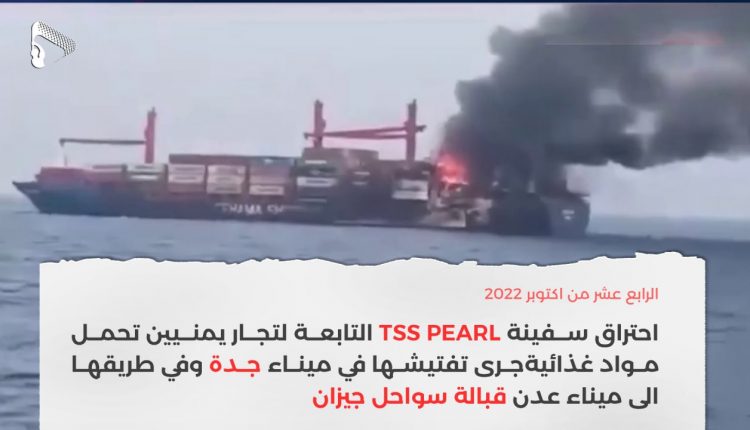 وقال” نشب حريق في السفينة واستمر تسعة أيام قبالة ميناء جيزان بالمياه الإقليمية السعودية حيث كانت تحمل على متنها أكثر من 28 الف طن من البضائع والسلع الغذائية والدوائية موزعة في ألف و853 حاوية تابعة لتجار يمنيين كانت في طريقها إلى ميناء عدن”.