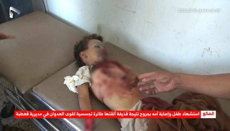 استشهد طفل وأصيبت أمه، الثلاثاء، في غارة جوية لطيران تجسسي تابع لتحالف العدوان الأمريكي السعودي الإماراتي في مديرية قعطبة الواقعة تحت سيطرة سلطات صنعاء شمال محافظة الضالع.