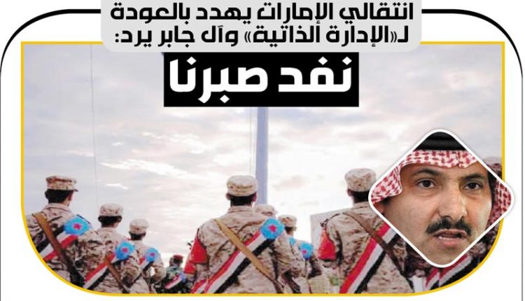 يبدو أن معركة الاستهلاك الإعلامي بين سفير الاحتلال السعودي ومرتزقة الإمارات في عدن أخذت منحى محرجا للطرفين، خصوصا بعد تهديد الأخيرين بفرض «الإدارة الذاتية» على كامل الجنوب وإنهاء العلاقة مع رئاسي الاحتلال، وطرد حكومة الفنادق من عدن، ليأتي الرد سريعا من آل جابر تهديداً بفرض إقامة جبرية على كل قيادات الانتقالي، واستدعاء فصائل تكفيرية حملت اسم «درع الوطن».