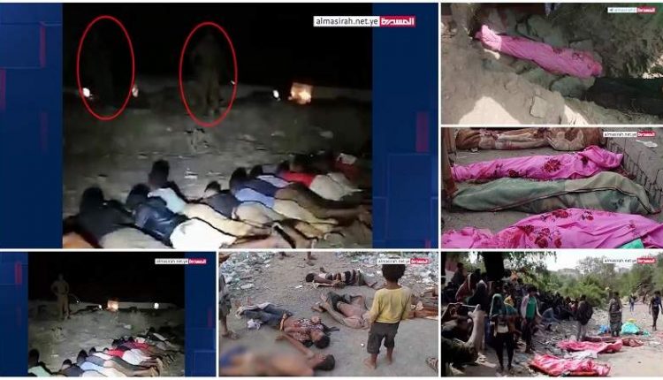 وأظهرت المشاهد التي بثتها قناة المسيرة، أمس السبت، عشرات الجثث لمجموعة كبيرة من الأفارقة الذين تم قتلهم على يد الجنود السعوديين، في حين يوضح بعض الناجين أن القتلى تمت تصفيتهم بطرق وحشية على يد حرس الحدود السعودي.
