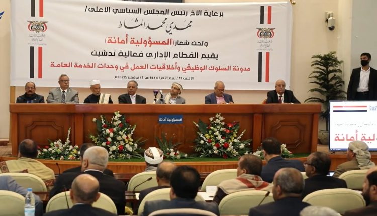 ونظرا لما تتميز به المدونة من كونها مستمدة من المنهجية القرآنية، ومنسجمة مع الهوية الإيمانية، ولما تمثله من أهمية قصوى، فقد أكد رئيس المجلس السياسي الأعلى المشير مهدي المشاط، خلال تدشين مدونة السلوك الوظيفي وأخلاقيات العمل في وحدات الخدمة العامة، على أهمية المدونة السلوكية التي تأتي في إطار حرص وسعي الجميع على الارتقاء والأداء المتميز لرجل المسؤولية، رجل الدولة، موضحا أنه سيكون هناك تقييم لكل الجهات بمدى الالتزام بالمدونة وإجراءات ضابطة لمن يخل بها، وكذا التقييم المستمر للانضباط وفق مدونة السلوك الوظيفي