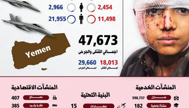 استشهاد وجرح 47 ألف و673 مواطناً بينهم 8800 طفل..خلال 2800 يوم من العدوان على اليمن