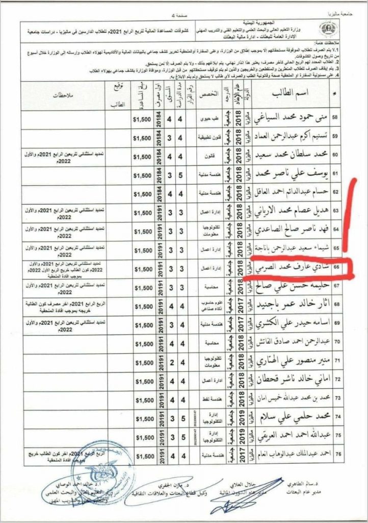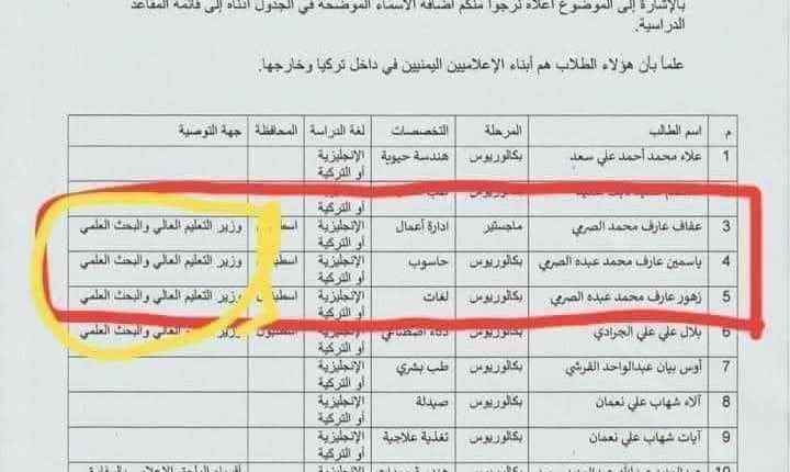 وشملت المنح الدراسية البالغة أكثر من 4900 منحة أبناء وأقارب الوزراء والمسؤولين وقيادات عسكرية وحزبية ورجال أعمال وأعضاء برلمانيين ومشائخ ووكلاء وزاراة وإعلاميين في حكومة المرتزقة.