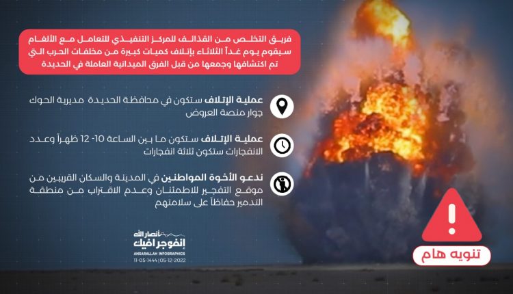 أعلن المركز التنفيذي للتعامل مع الألغام، أنه سيتم ظهر الثلاثاء إتلاف كميات كبيرة من مخلفات الحرب، التي تم اكتشافها وجمعها من قبل الفرق الميدانية العاملة في الحديدة.