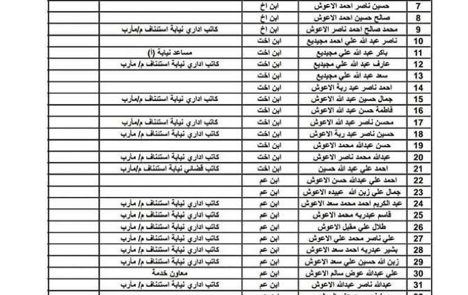 وتداول ناشطون مساء اليوم، كشفاً مكوناً من ورقتين يضم 96 شخصاً من أقارب ما يسمى برئيس المحكمة العليا في حكومة تحالف العدوان والنائب العام السابق الموالي لمليشيا حزب الإصلاح المرتزق علي الأعوش، الذين قام بتوظيفهم، وبدون مؤهلات.
