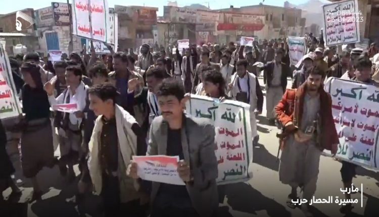 مسيرة جماهيرية حاشدة في الجوبة بمأرب تحت شعار الحصار حرب “تفاصيل+صور”
