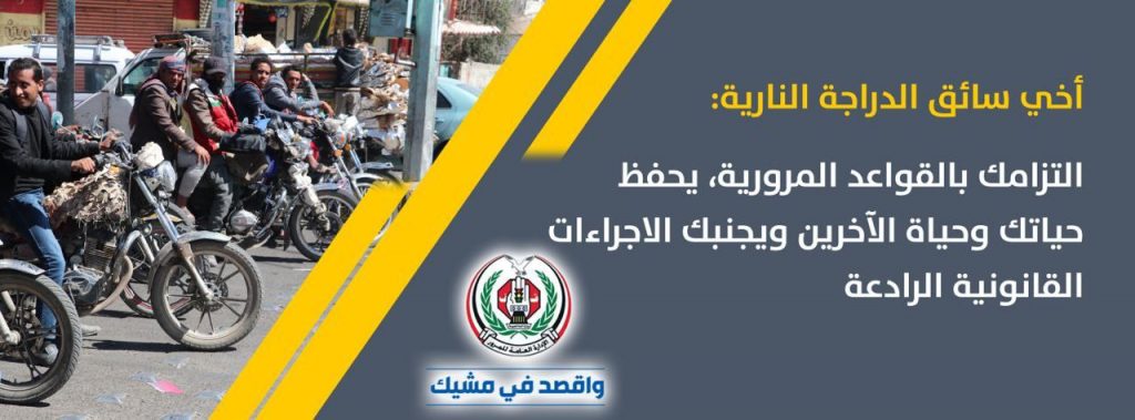 ” واقصد_في_مشيك “، عنوان حملة توعوية ترعاها إدارة المرور في العاصمة صنعاء والمحافظات المحررة، بقصد الحفاظ على النفس البشرية المهدورة، والمرهونة بفرامل وسيلة نقل، مجنونة بضغط قدم جاهل أو مستعجل أو بسبب استعراض مراهق عقليا في لحظة ما.