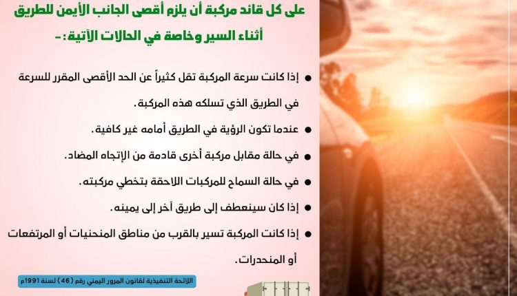 على كل قائد مركبة أن يلزم أقصى الجانب الأيمن للطريق أثناء السير وخاصة في الحالات الآتية “تفاصيل”