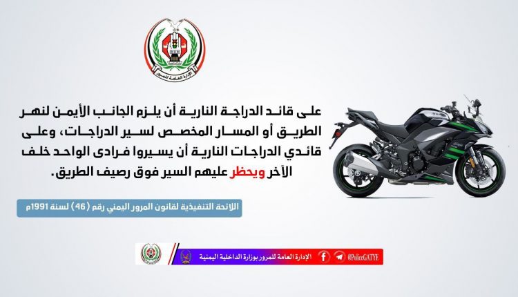 دعت الإدارة العامة للمرور بصنعاء، جميع سائقي الدراجات النارية في أمانة العاصمة والمحافظات أن يلزموا الجانب الأيمن لنهر الطريق أو المسار المخصص لسير الدراجات النارية.