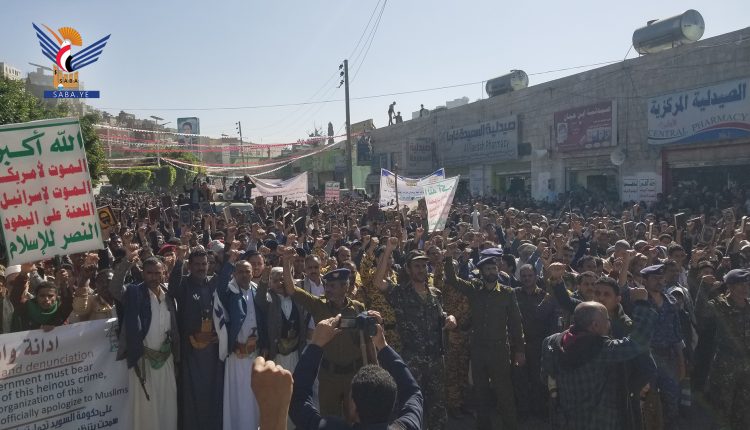 وخلال المسيرة اعتبر أمين عام المجلس المحلي بالمحافظة اسماعيل المهيم ما يحصل من استفزاز لمشاعر المسلمين، اختباراً لمدى جاهزية وصحوة الأمة العربية والإسلامية وغيرتها على مقدساتها.