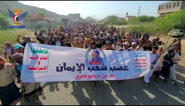 شهدت عدد من مديريات محافظة ريمة، الأربعاء، مسيرات ووقفات احتجاجية تنديداً بجريمة إحراق نسخة من القرآن الكريم في السويد.