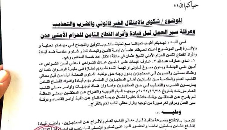 وتناقل الناشطون وثيقة صادرة من ما يسمى “نيابة استئناف عدن”، أكدت أن ميليشيا ما يسمى “القطاع الثامن للحزام الأمني” التابع للاحتلال الإماراتي، قامت باعتقال خمسة أشخاص معظمهم أطفال قبل أكثر من 45 يوماً بدون أية أسباب أو توجيه أية تهمة لهم، حيث لا يزال الأطفال المعتقلون مغيبين عن أهاليهم حتى اليوم حسب الوثيقة.