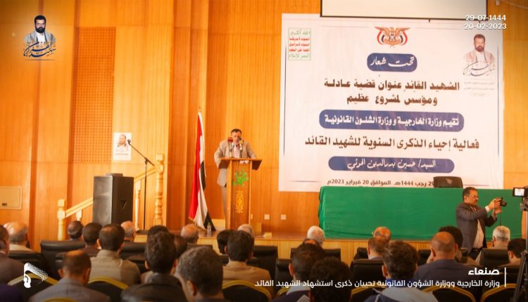 جاء ذلك خلال فعالية نظمتها، أمس الإثنين وزارتا الشؤون القانونية والخارجية بالذكرى السنوية للشهيد القائد حسين بن بدر الدين الحوثي.
