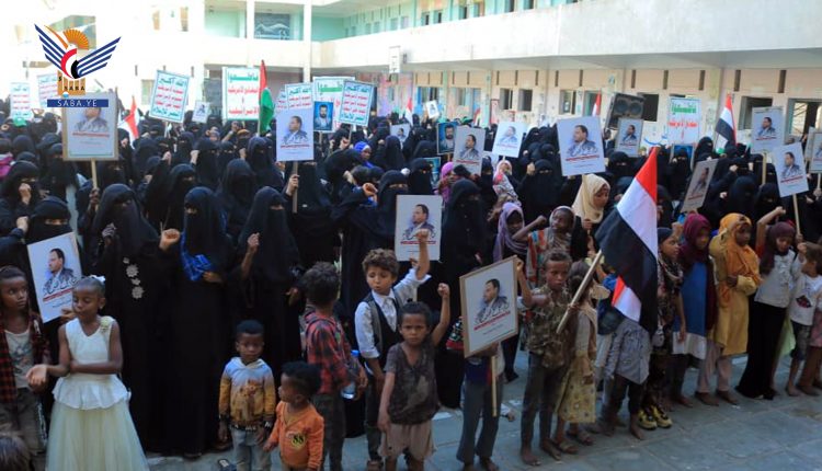 ورفعت المشاركات في المسيرة التي نظمت في ساحة مدرسة عمار بن ياسر بمشاركة حرائر مديريات الحوك والميناء والحالي، صور الشهيد الصماد واللافتات المعبرة عن التضامن مع الشعب الفلسطيني.