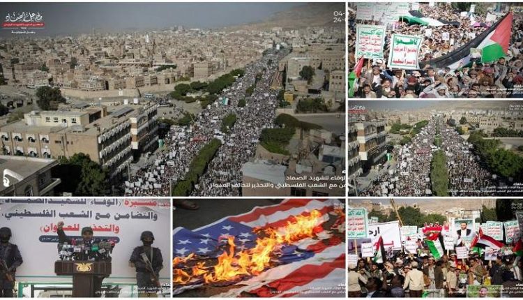 في مسيرات جماهيرية شعبية مليونية غاضبة، تدافقت جموع اليمنيين كالسيل الجرار.. زرافات ووحدانا من كل حدب وصوب، واكتضت بهم أكثر من ثلاثين ساحة وميداناً في العاصمة صنعاء و12 محافظة وعدد من المديريات، استجابة لدعوة قائد الثورة السيد عبدالملك بدر الدين الحوثي (يحفظه الله)، في كلمته بمناسبة الذكرى السنوية للشهيد الصماد 1444هـ، وذلك تحت شعار «الوفاء للشهيد الرئيس صالح الصماد والتضامن مع الشعب الفلسطيني، والتحذير لدول العدوان».