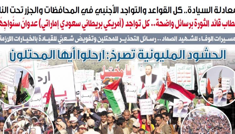موقف قائد الثورة أكده الشعب اليمني في المسيرات المليونية الحاشدة التي دعا لها السيد القائد وخرجت يوم الجمعة بشكل مليوني، كرس معادلة عسكرية جديدة بالتحذير المباشر بأن القواعد والتواجد الأجنبي في اليمن عدوان واحتلال، وسيتم التعامل معه بناء على ذلك…وهو ما ينبغي على العدو التعامل معه على نحو جدّي، فاليمن لن يقبل بأي شكل للتواجد الأجنبي على أي من أراض الجمهورية اليمنية، وهي مسألة جوهرية قامت ثورة الـ 21 من سبتمبر على أساس العمل بها وفرضها عمليا وإعادة كل اليمن وثرواته إلى أهلها.