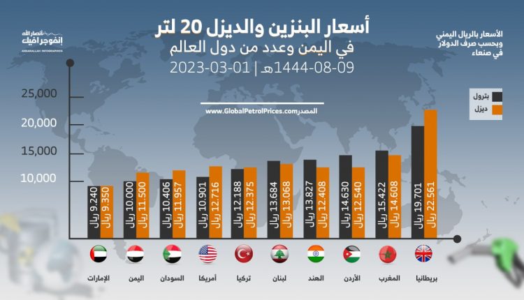 إنفوجرافيك: يوضح أسعار الوقود في اليمن وعدد من دول العالم.