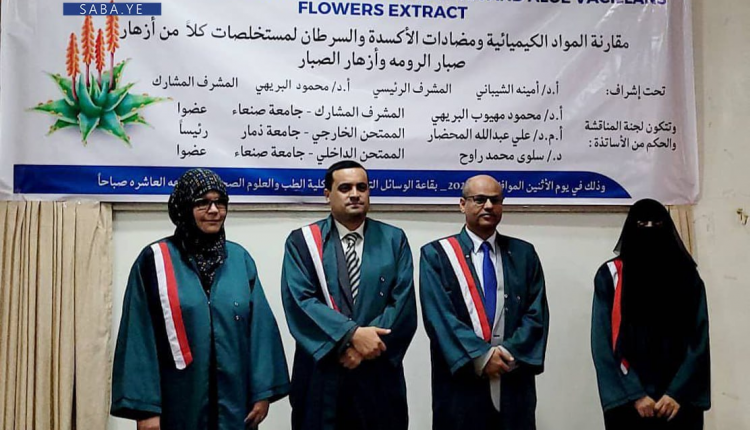 وأشادت لجنة المناقشة والحكم برئاسة الدكتور علي المحضار ممتحناً خارجياً من جامعة ذمار، وعضوية الدكتور أمينة الشيباني مشرفاً رئيسياً والدكتور محمود البريهي مشرفاً مشاركاً من جامعة صنعاء، والدكتورة سلوى محمد راوح ممتحناً داخلياً جامعة صنعاء عضوا، بالنتائج التي خلصت إليها الدراسة، وأظهرت مدى فاعلية وكفاءة هذين النوعين من الصبار لمضادات الأكسدة والسرطان.