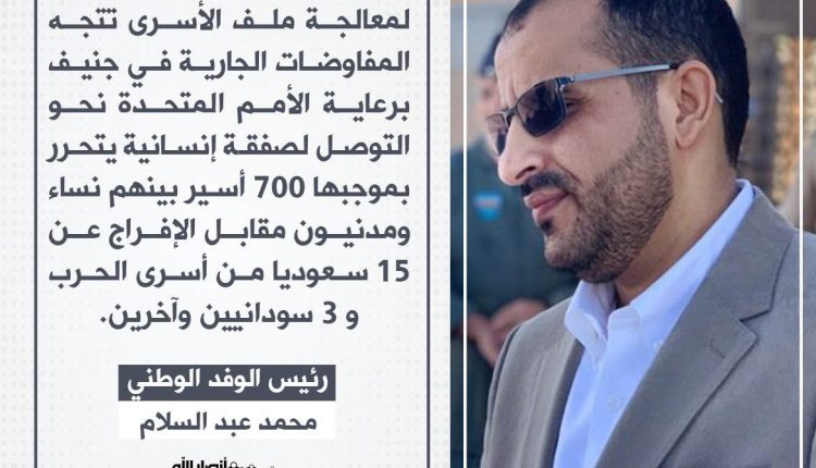 كشف رئيس الوفد الوطني المفاوض محمد عبدالسلام، اليوم الاثنين، أن المفاوضات الجارية بشأن ملف الأسرى تتجه نحو إتمام صفقة تبادل تشمل 700 أسير بينهم نساء ومدنيون مقابل الإفراج عن 15 سعوديا من أسرى الحرب و3 سودانيين وآخرين.