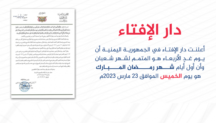 أعلنت دار الإفتاء في الجمهورية اليمنية أن يوم غدٍ الأربعاء هو المتمم لشهر شعبان، وأن يوم الخميس الموافق 23 مارس 2023م هو أول أيام شهر رمضان المبارك 1444هـ.