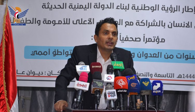 عقدت وزارة حقوق الإنسان بالشراكة مع المجلس الأعلى للأمومة والطفولة، الأربعاء، مؤتمراً صحفياً بمرور ثماني سنوات من العدوان والحصار التآمر الدولي والتواطؤ الأممي.