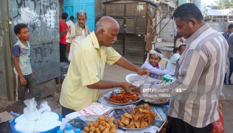 A Yemeni man buys from a street vendor in the southern Yemeni city of Aden on April 27, 2020, during the Muslim holy month of Ramadan. (Photo by Saleh Al-OBEIDI / AFP) (Photo by SALEH AL-OBEIDI/AFP via Getty Images)