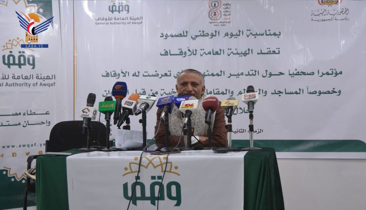 في مؤتمر صحفي للهيئة العامة للأوقاف اليوم بـ صنعاء، كشفت الهيئة خلاله عن جملة من الإحصائيات والأرقام للتدمير الممنهج للأوقاف وخصوصاً المساجد والمقامات من قبل العدوان خلال ثمان سنوات من العدوان والحصار.