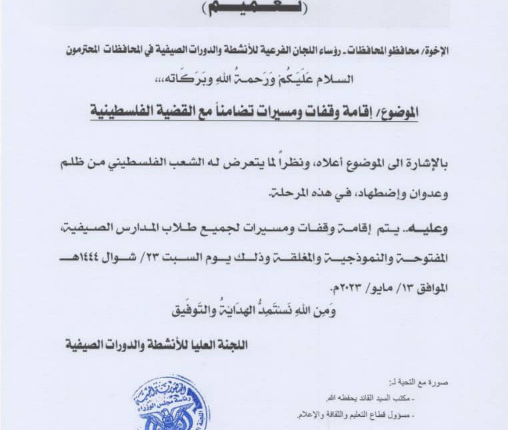أعلنت اللجنة العليا للدورات الصيفية، عن إقامة وقفات ومسيرات صباح يوم غدٍ السبت، تضامناً مع القضية الفلسطينية.