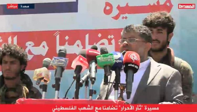 وقال الحوثي في كلمة له خلال مسيرة جماهيرية حاشدة في محافظة صعدة نصرة للشعب الفلسطيني، قال الحوثي: لقد رأينا العدو اليهودي الذي يرتكب المجازر الإرهابية، وهيو يقصف المقابر المساكن كما قصفت أمريكا والسعودية والإمارات المقابر والمساكن في اليمن، لأن لدينا موقفا ثابتا من القضية الفلسطينية ومن قضايا الأمة العربية والإسلامية.