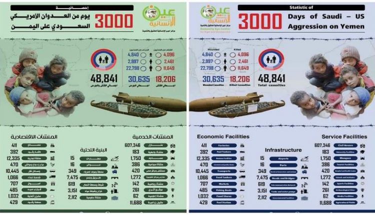 أصدر مركز عين الإنسانية، اليوم الأحد، إحصائية 3000 يوم من العدوان الأمريكي السعودي على اليمن.