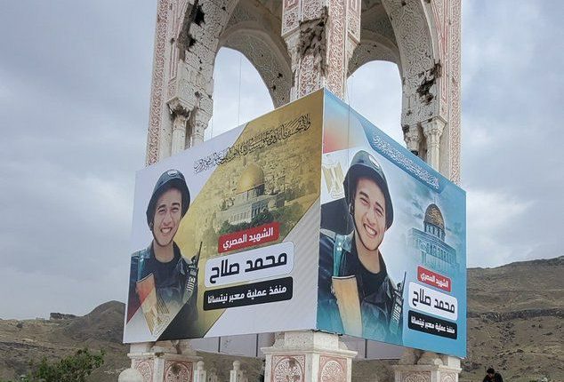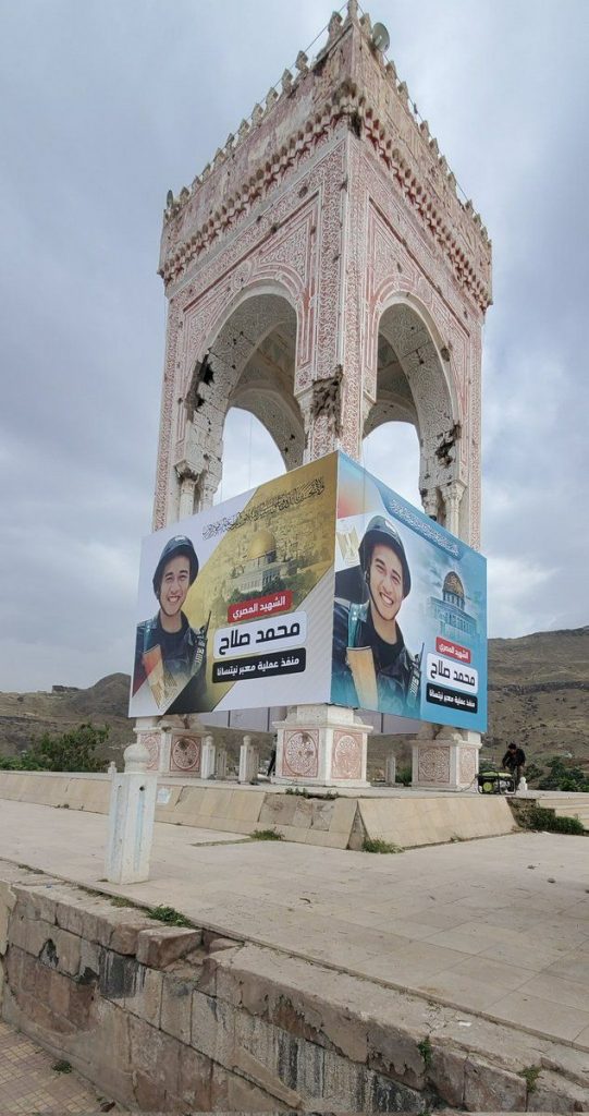 تشرفت العاصمة اليمنية صنعاء اليوم الإثنين, برفع صورة الشهيد المصري البطل محمد صلاح, على النصب المصري شمال أمانة العاصمة, بعد أيام من صدور توجيهات رئيس اللجنة الثورية العليا محمد علي الحوثي برفع صورته تخليدا لموقفه البطولي في عملية سيناء التي أطاحت بـ5 ضباط وجنود صهاينة الشهر المنصرم.
