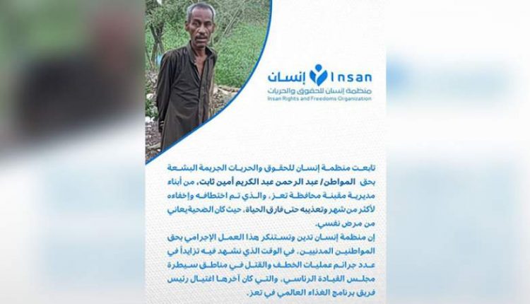 أدانت منظمة إنسان للحقوق والحريات الجريمة البشعة بحق المواطن عبد الرحمن عبد الكريم أمين ثابت، من أبناء مديرية مقبنة بمحافظة تعز، الذي تم اختطافه واخفاءه من قبل مرتزقة العدوان لأكثر من شهر وتعذيبه حتى فارق الحياة.