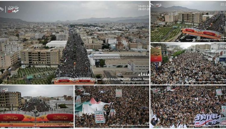 ورددت الحشود، هتافات الحرية وشعار الحسين “هيهات منا الذلة”، والتأكيد على مضي الشعب اليمني على نهج وموقف وتضحية سبط رسول الله وثورته ضد الطغاة والمستكبرين والظالمين.