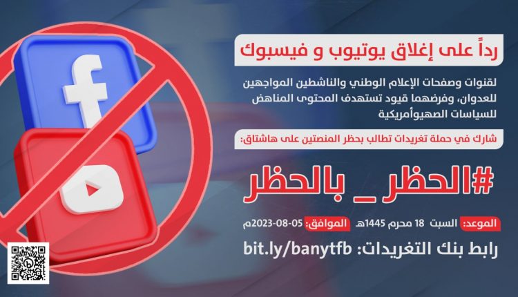 ودعا المنظمون للحملة، إلى المشاركة الواسعة في حملة التغريدات رداً على إغلاق “يوتيوب وفيسبوك” لقنوات وصفحات الإعلام الوطني والناشطين المواجهين للعدوان، وفرضهما قيود تستهدف المحتوى المناهض للسياسات الصهيوأمريكية، على الهاشتاق: