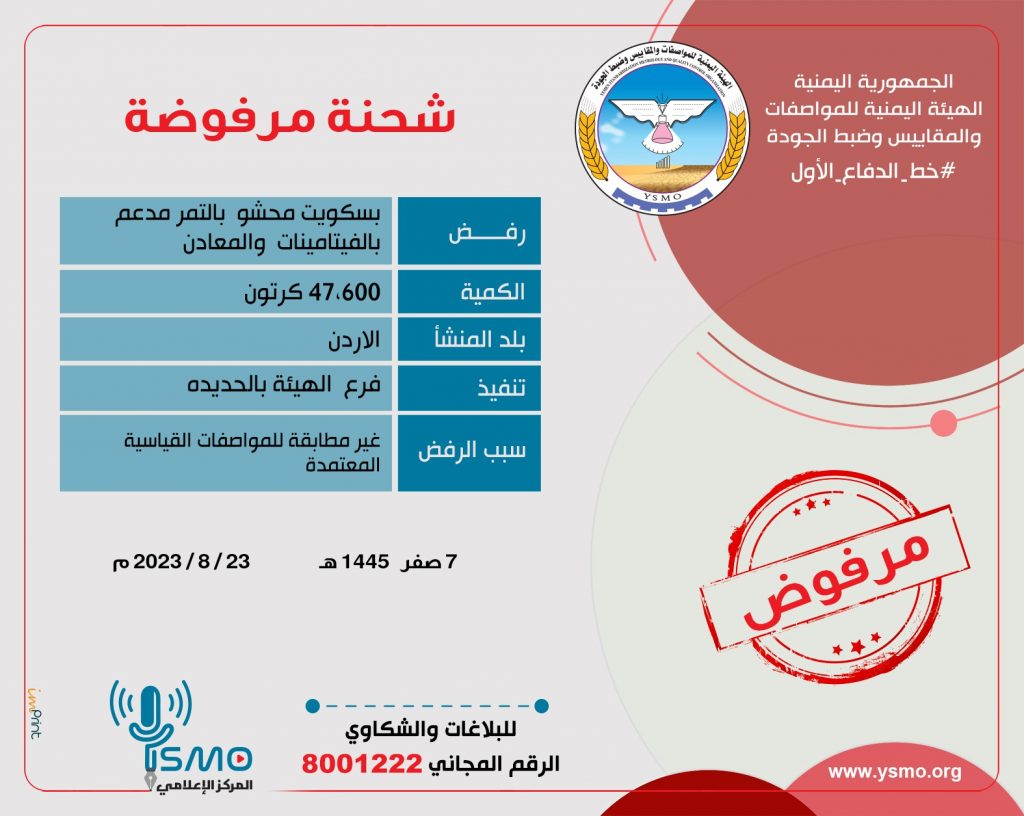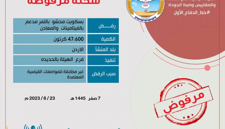 رفضت الهيئة اليمنية للمواصفات والمقاييس وضبط الجودة عبر فرعها في الحديدة، دخول شحنة بسكويت محشو بالتمر مدعم بالفيتامينات والمعادن مخالفة للمواصفات القياسية.