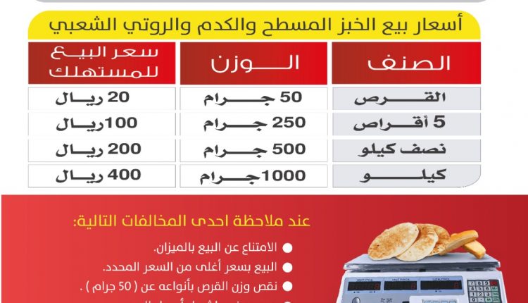 رحبت النقابة العامة للمخابز والافران بقرار وزارة الصناعة والتجارة بتحديد سعر الكيلو الجرام للخبز بكافة أنواع بمبلغ 400 ريال وكذا تحديد حجم قرص الخبز الواحد بوزن 50 جرام .