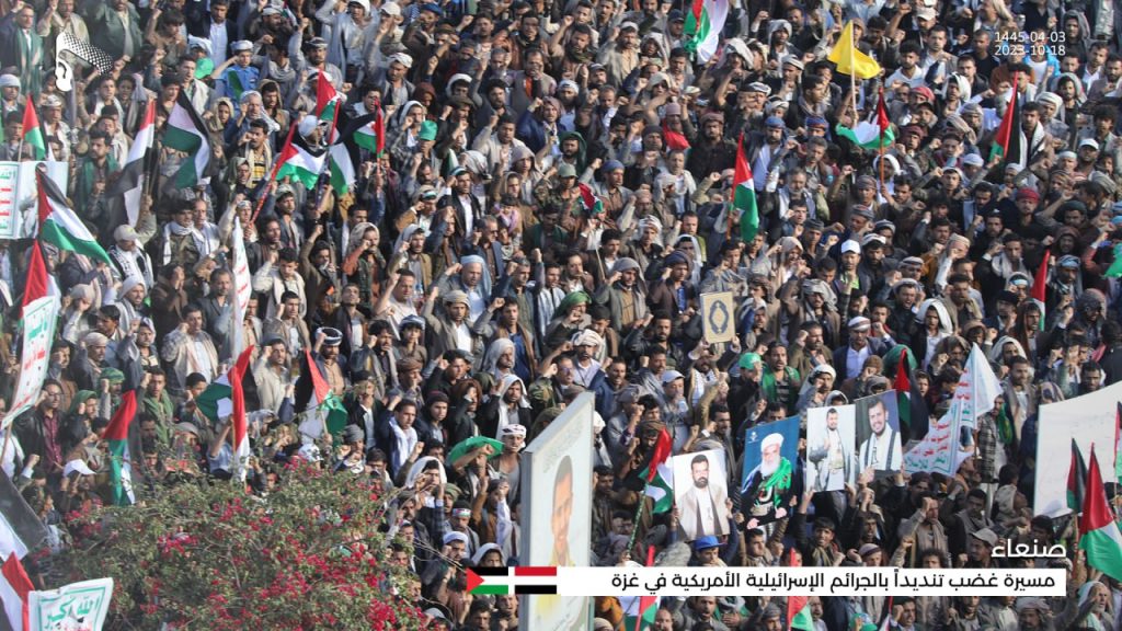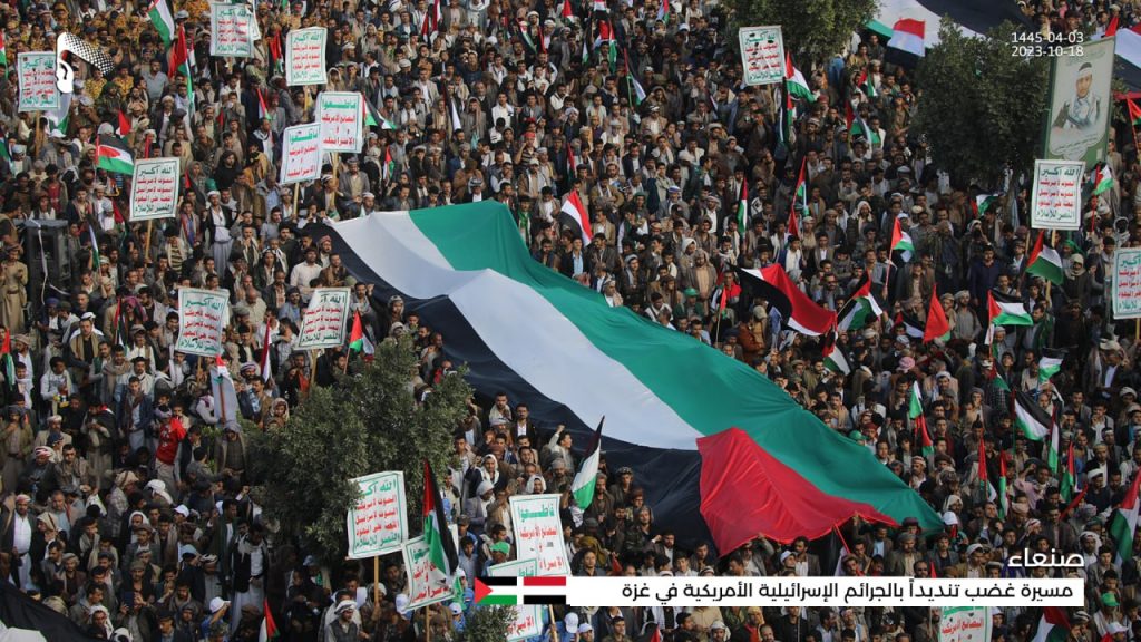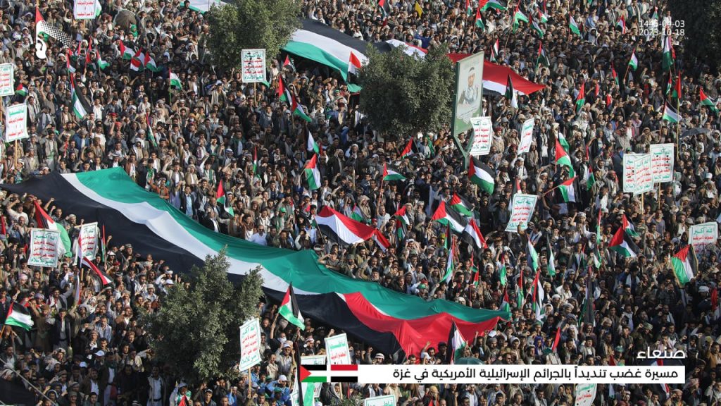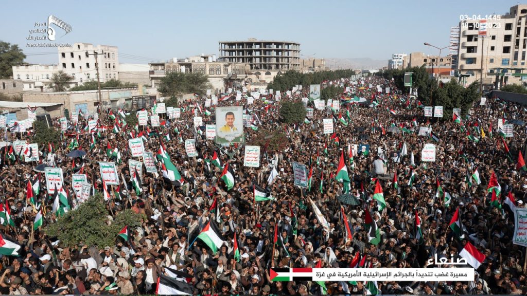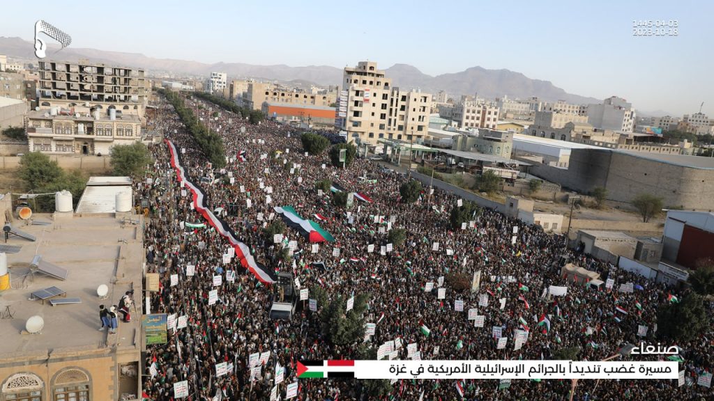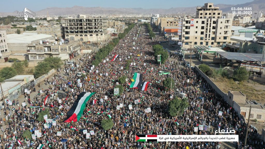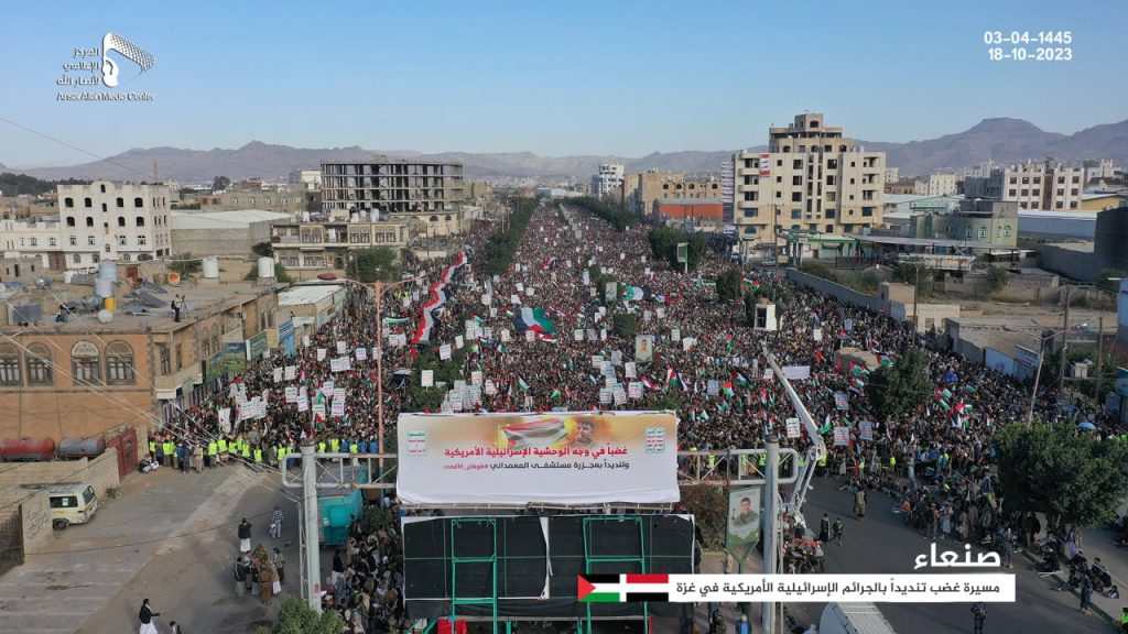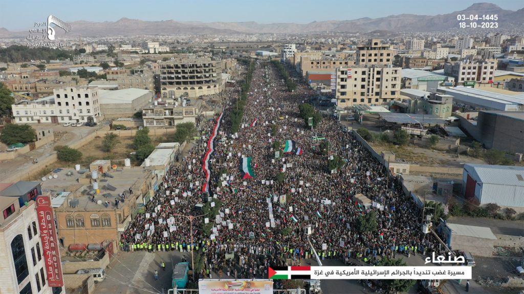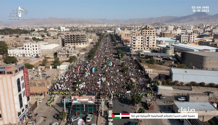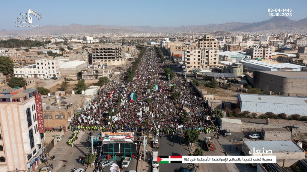 صور جوية من المسيرة الجماهيرية الحاشدة في العاصمة صنعاء تنديداً بالجرائم الإسرائيلية الأمريكية في غزة 03-04-1445 | 18-10-2023