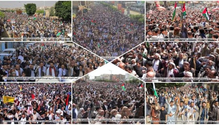 واحتشد الآلاف من العاصمة في 23 ساحة بالمديريات العشر، الذين تقاطروا من كل الأحياء والحارات، حاملين الأعلام الفلسطينية واللافتات المؤكدة على مساندة الشعب اليمني ودعمه الكامل والمستمر للشعب الفلسطيني ومقاومته الباسلة ومباركته لعملية “طوفان الأقصى” حتى تحقيق النصر ودحر الاحتلال الصهيوني.
