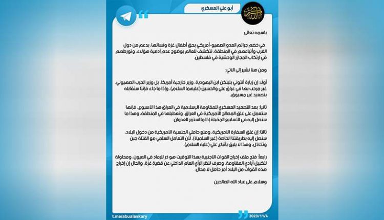 وقال المسؤول الأمني لكتائب حزب الله في العراق، أبو علي العسكري، في بيان نشره في تلجرام، أن “زيارة أنتوني بلينكن “ابن اليهودية”، وزير خارجية أمريكا، بل وزير الحرب الصهيوني، غير مرحب بها في عراق الإمام علي والإمام الحسين (عليهما السلام)، وإذا ما جاء فإننا سنقابله بتصعيد غير مسبوق”.