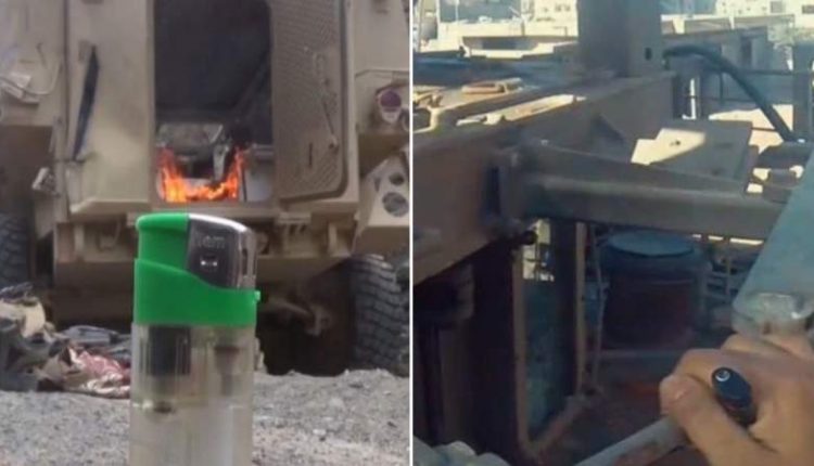 الصوره الأولى إحراق آلية سعودية في اليمن بالولاعة، والثانية إحراق مدرعة صهيونية بالولاعة في غزة.