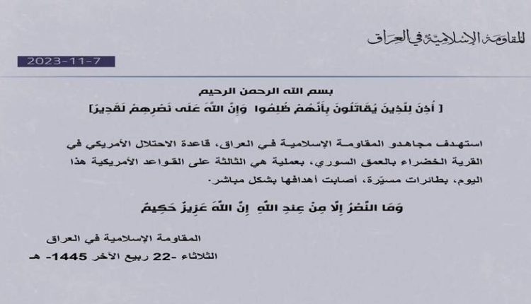 وتواصل المقاومة الإسلامية في العراق استهداف القواعد الأمريكية في سوريا والعراق، ومنها: عين الأسد، التنف، الحرير، كونيكو، حقل العمر النفطي، خراب الجير، في ظل استمرار العدوان الإسرائيلي، بدعم أمريكي، على قطاع غزّة.