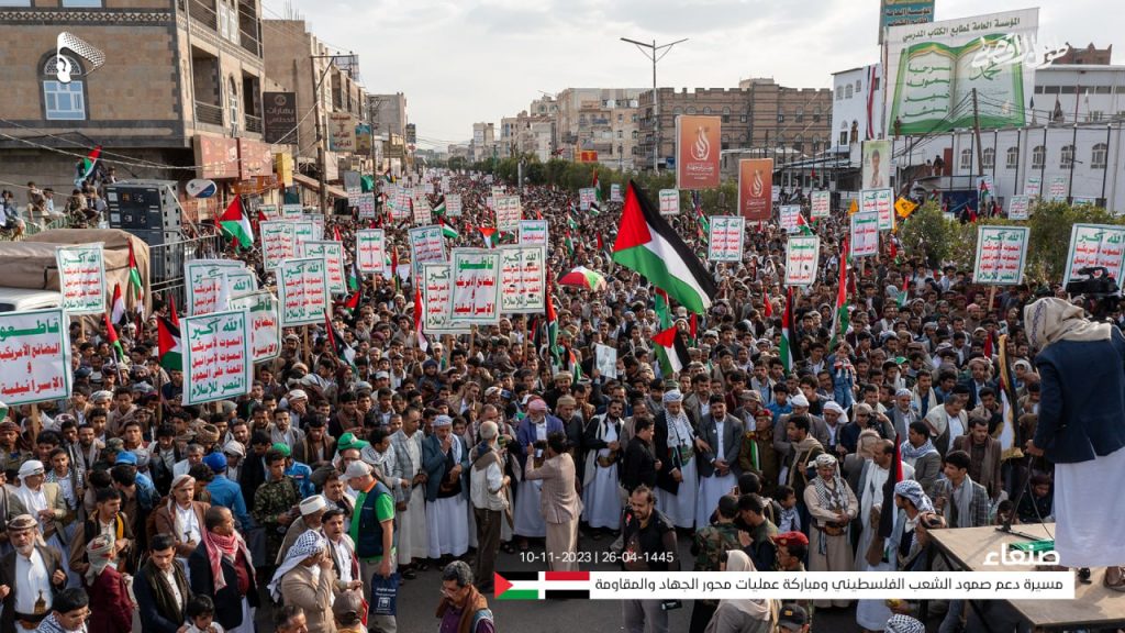 صور جوية من المسيرة الحاشدة في العاصمة صنعاء في جمعة (دعم صمود الشعب الفلسطيني ومباركة عمليات محور الجهاد والمقاومة)               26-04-1445 | 10-11-2023