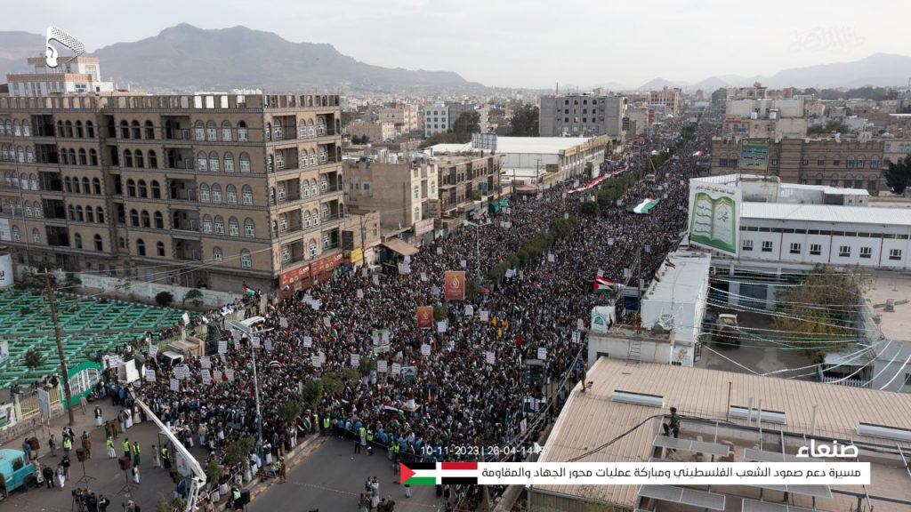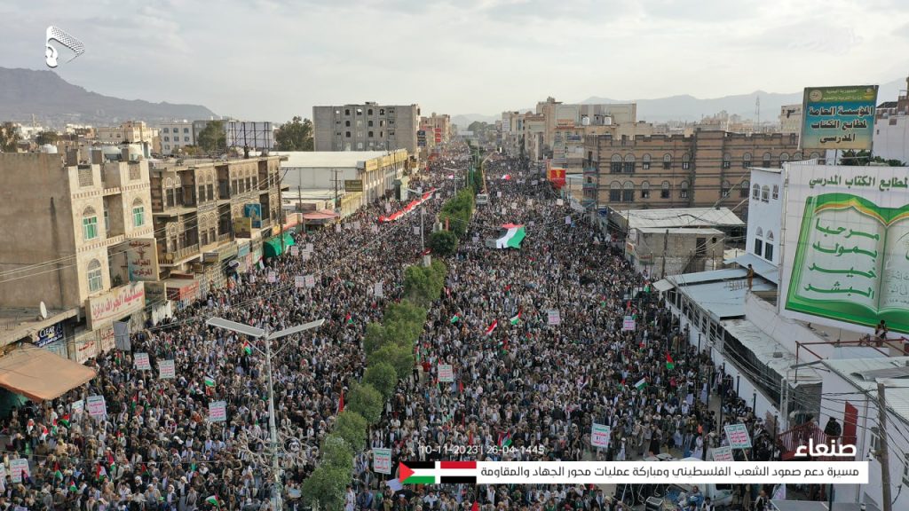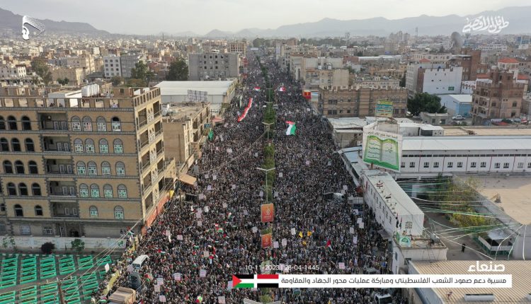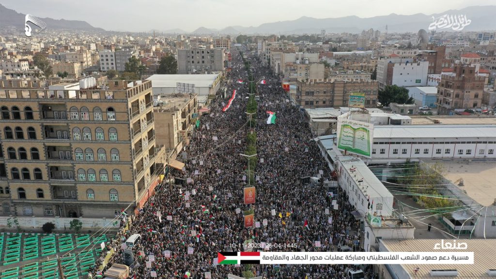 أول الصور الجوية من المسيرة الحاشدة في العاصمة صنعاء في جمعة (دعم صمود الشعب الفلسطيني ومباركة عمليات محور الجهاد والمقاومة)