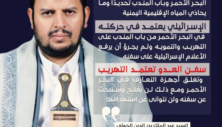 وقال السيد القائد في كلمة له خلال تدشين فعاليات الذكرى السنوية للشهيد: عيوننا مفتوحة للرصد الدائم والبحث عن أي سفينة إسرائيلية في البحر الأحمر وباب المندب تحديدًا وما يحاذي المياه الإقليمية اليمنية.. موضحا أن الإسرائيلي يعتمد في حركته في البحر الأحمر من باب المندب على التهريب والتمويه ولم يجرؤ أن يرفع الأعلام الإسرائيلية على سفنه.