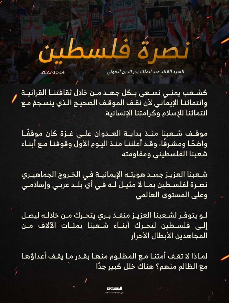 وقال السيد عبدالملك في كلمة له خلال تدشين فعاليات الذكرى السنوية للشهيد: لو يتوفر لشعبنا العزيز منفذ بري يتحرك من خلاله ليصل إلى فلسطين لتحرك أبناء شعبنا بمئات الآلاف من المجاهدين الأبطال الأحرار”، وطالب السيد القائد من الدول التي تفصل جغرافيًا بيننا وبين فلسطين ولو على الأقل ليختبروا مصداقيتنا أن يفتحوا منفذًا بريًا للمرور فقط يصل عبره أبناء شعبنا إلى فلسطين.. وأضاف ” : لن نألوا جهدًا على المستوى العسكري بالوسائل المتاحة، وإخوتنا في القوة الصاروخية نفذوا عددًا من العمليات إلى جنوب فلسطين المحتلة.