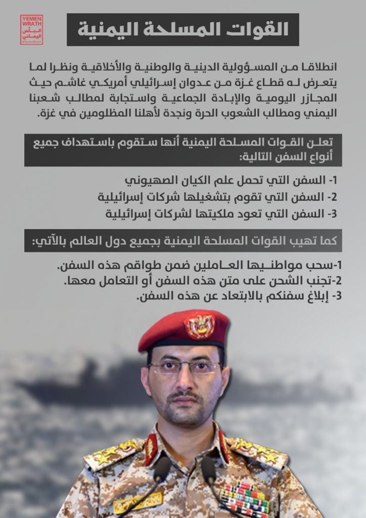 وأفادت القوات المسلحة في بيان تلقت وكالة الأنباء اليمنية (سبأ) نسخة منه، بأنها ستقوم باستهداف جميع السفن التي تحمل علم الكيان الصهيوني، والسفن التي تقوم بتشغيلها شركات إسرائيلية، أو تعود ملكيتها لشركات إسرائيلية.