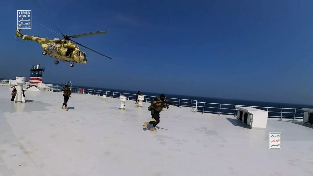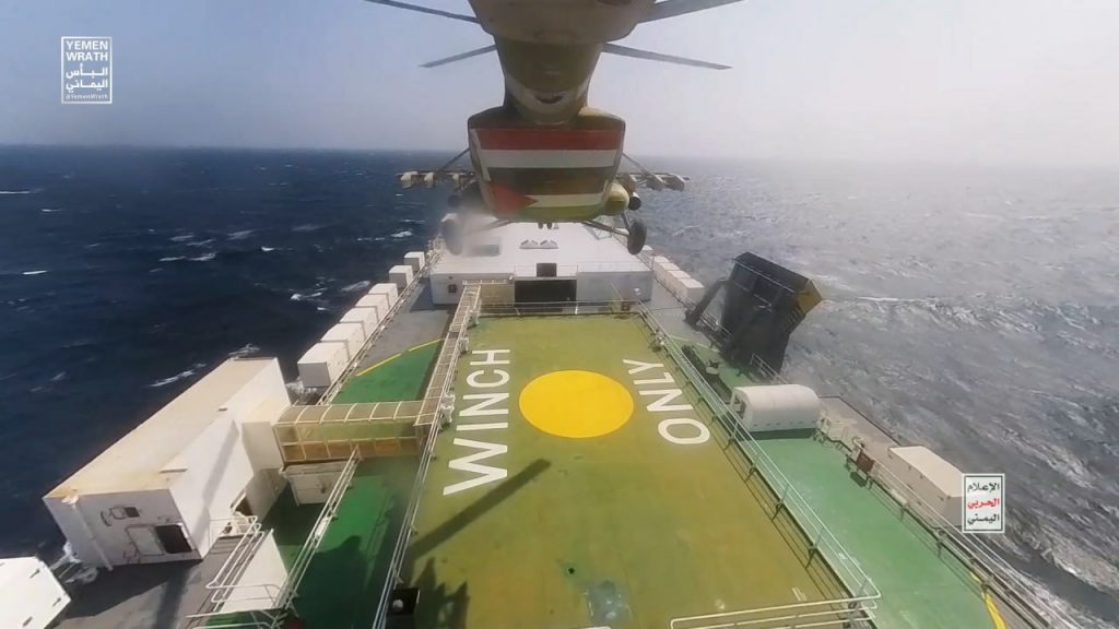 وأظهرت المشاهد عملية إنزال جوي من طائرة هليكوبتر عسكرية تابعة للقوات المسلحة اليمنية، على ظهر السفينة الإسرائيلية بعد عملية رصد ومراقبة.