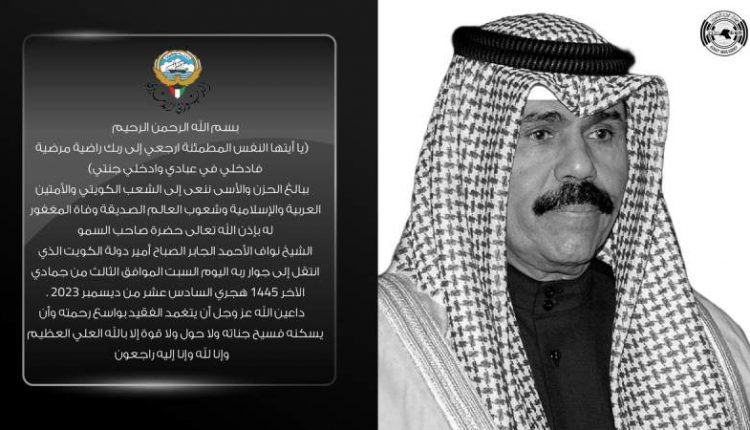 وقال وزير شؤون الديوان الأميري الكويتي: “ببالغ الحزن والأسى ننعى إلى الشعب الكويتي والأمتين العربية والإسلامية وشعوب العالم الصديقة وفاة المغفور له بإذن الله تعالى حضرة صاحب السمو أمير البلاد الشيخ نواف