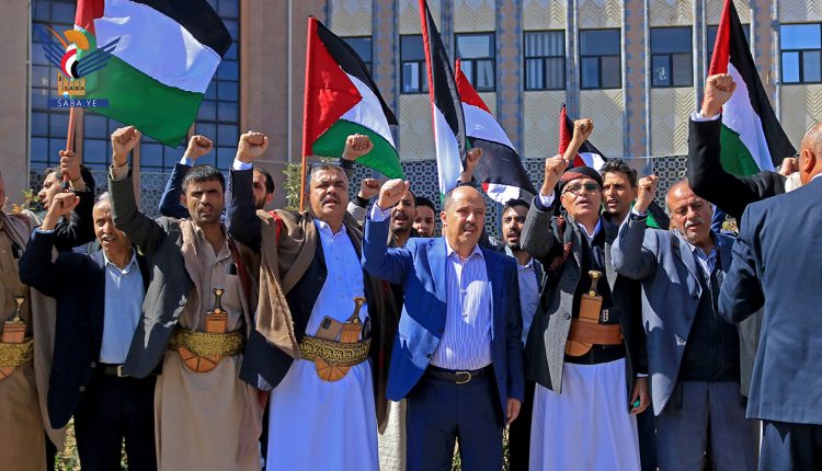 وخلال الوقفة أكد نائب وزير الصناعة والتجارة أحمد الشوتري، أن الوقفة التضامنية لموظفي الوزارة تأتي ضمن الموقف اليمني الشجاع والمشرف مع أبناء الشعب الفلسطيني الصامد في وجه الصلف والإجرام والإرهاب الصهيوني.