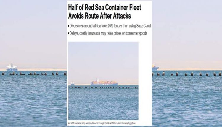 كشف موقع “بلومبرغ” أن نصف أسطول سفن الحاويات الذي يعبر البحر الأحمر وقناة السويس بانتظام، يتجنب المسار الآن، وفقًا لبيانات جديدة، بسبب عمليات القوات المسلحة اليمينة، في ظل استمرار العدوان الإسرائيلي على غزة لليوم 83.